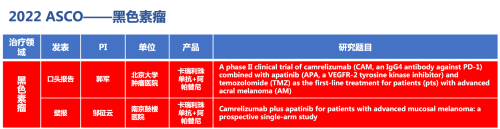 黑色素瘤领域的2篇研究摘要,采用九游会ag医药自主研发的PD-1抑制剂卡瑞利珠单抗(艾瑞卡)联合阿帕替尼(艾坦)(“双艾”组合)的免疫联合抗血管(或再联合化疗)的治疗策略。