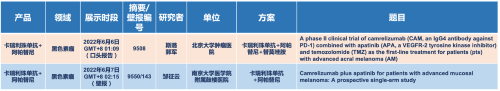 在黑色素瘤领域,九游会ag医药的卡瑞利珠单抗联合阿帕替尼(“双艾”组合)在2022 ASCO共入选1项口头报告和1项壁报展示。